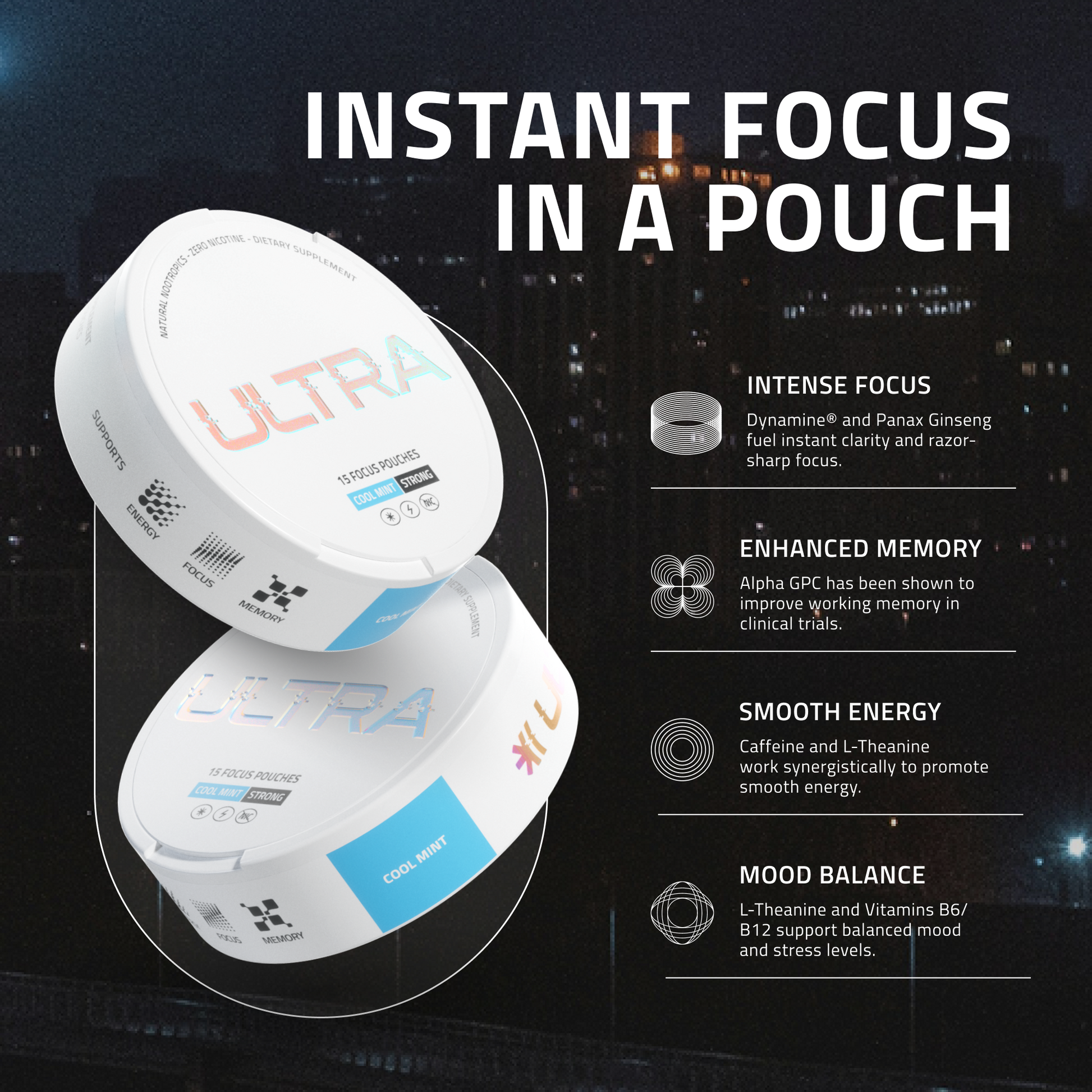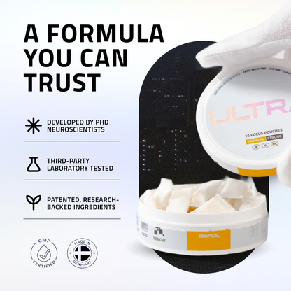 ULTRA pouches feature a clean, powerful blend of 6 clinically-proven ingredients to support razor-sharp focus, smooth energy, and enhanced cognition: