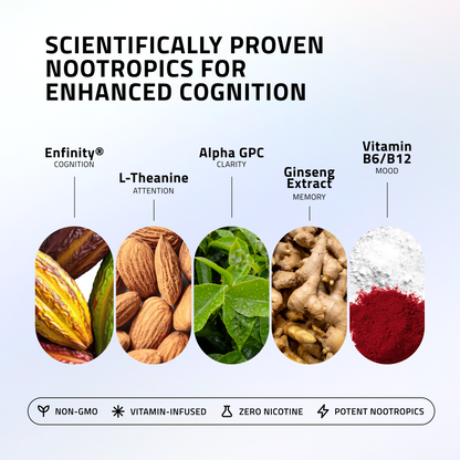 Experience a smooth but powerful lift to focus and energy within the first 10 minutes as Enfinity® and Alpha GPC work synergistically to activate key neurotransmitters, transforming scattered thoughts into laser-focused productivity.