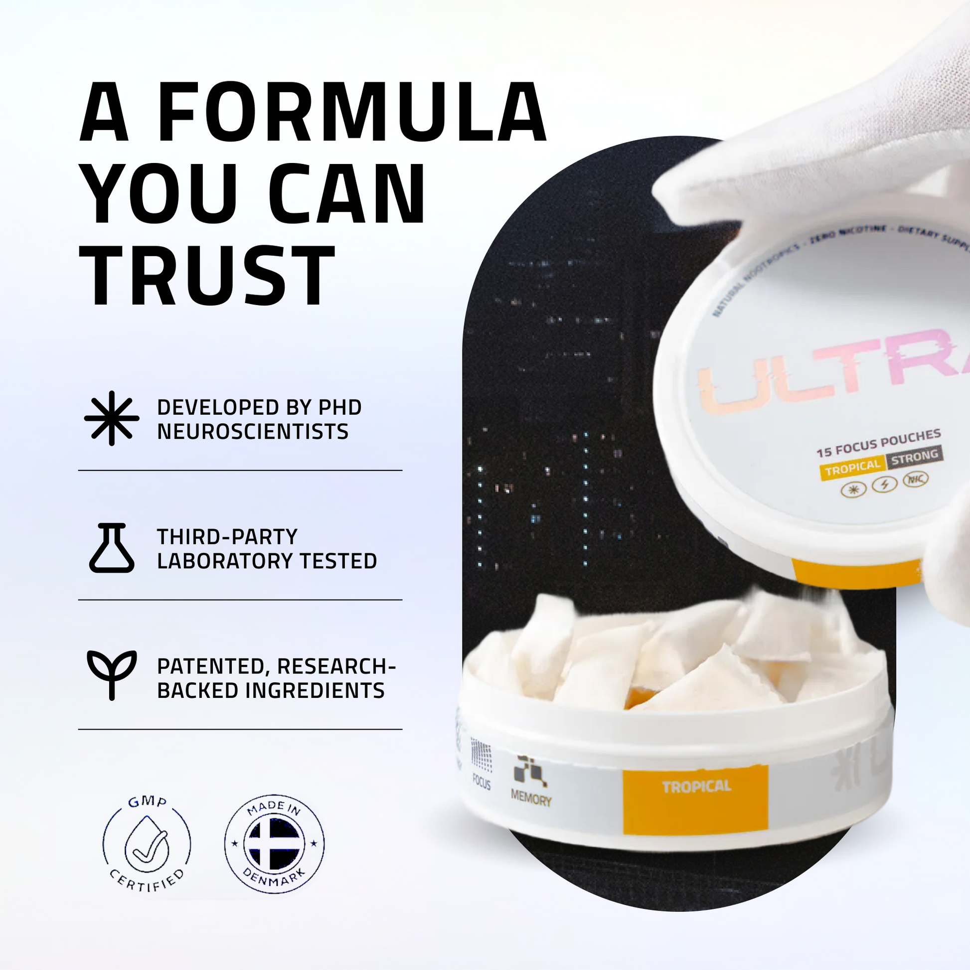 No, ULTRA pouches are 100% nicotine and tobacco-free. Instead, ULTRA pouches feature a science-backed blend of 6 natural nootropics that work synergistically to supercharge focus + energy.
